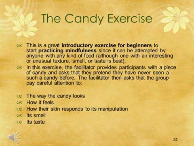 Dr. Buivydas discussed The Candy Exercise, an introductory exercise for practicing mindful eating. The exercise involves selecting a food (candy, for example), and paying careful attention to the way it looks, feels, smells, tastes, and how their skin responds to its manipulation.