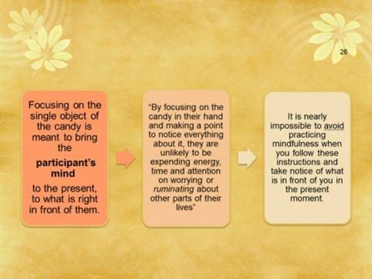 This type of mindfulness allows the participant to be present and pay attention to what is right in front of them. When focusing specifically on the food, your mind will be unlikely to wander to other parts of your life that might be causing you stress or worry.